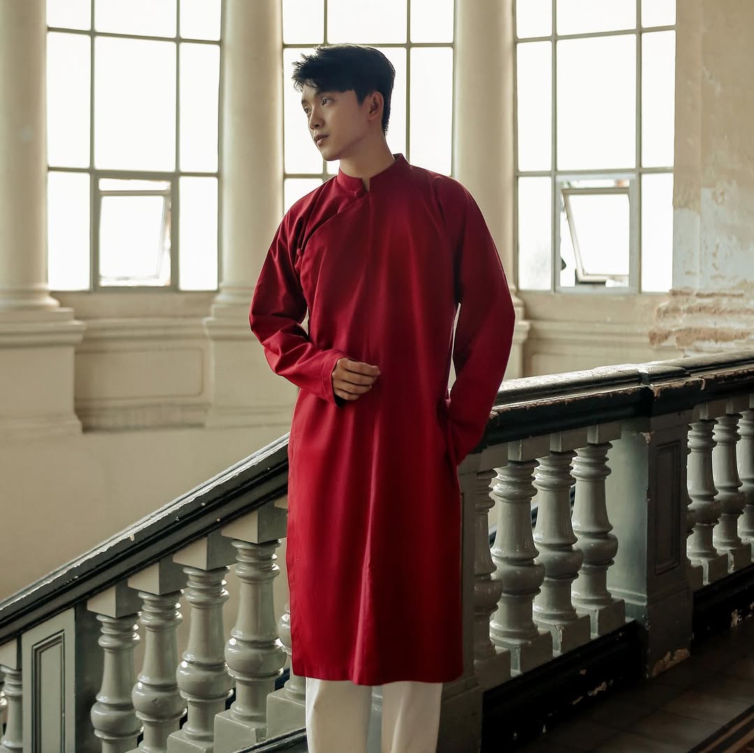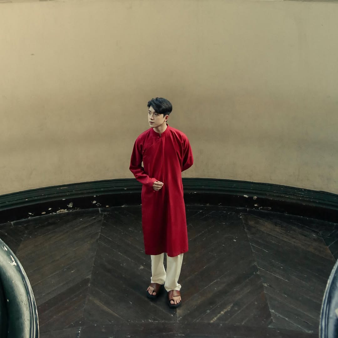 𝐀́𝐨 𝐃𝐚̀𝐢 𝐍𝐠𝐮̃ 𝐓𝐡𝐚̂𝐧 uses the basic silhouette of the traditional five-panel áo dài, featuring five round buttons running along the front, combined with linen fabric to create a design rich in vintage character